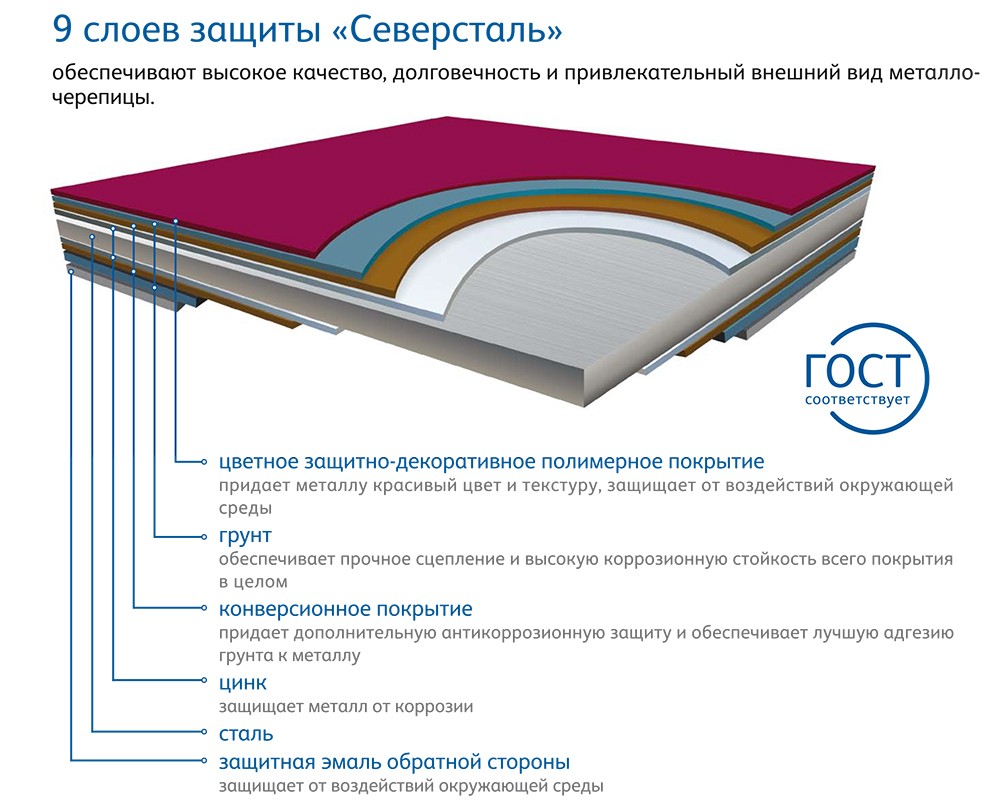 Профиль СуперМонтеррей по внешнему виду напоминает набегающую волну. Покрытие Стальной Кашемир толщиной 50 мкр позволяет существенно повысить светоустойчивость металлочерепицы до класса RUV4. Данное решение обеспечивает длительную эксплуатацию в условиях прямого воздействия ультрафиолетовых лучей, а также защищает от резких перепадов температуры и коррозии. Интенсивность цвета металлочерепицы сохранится на многие годы эксплуатации.