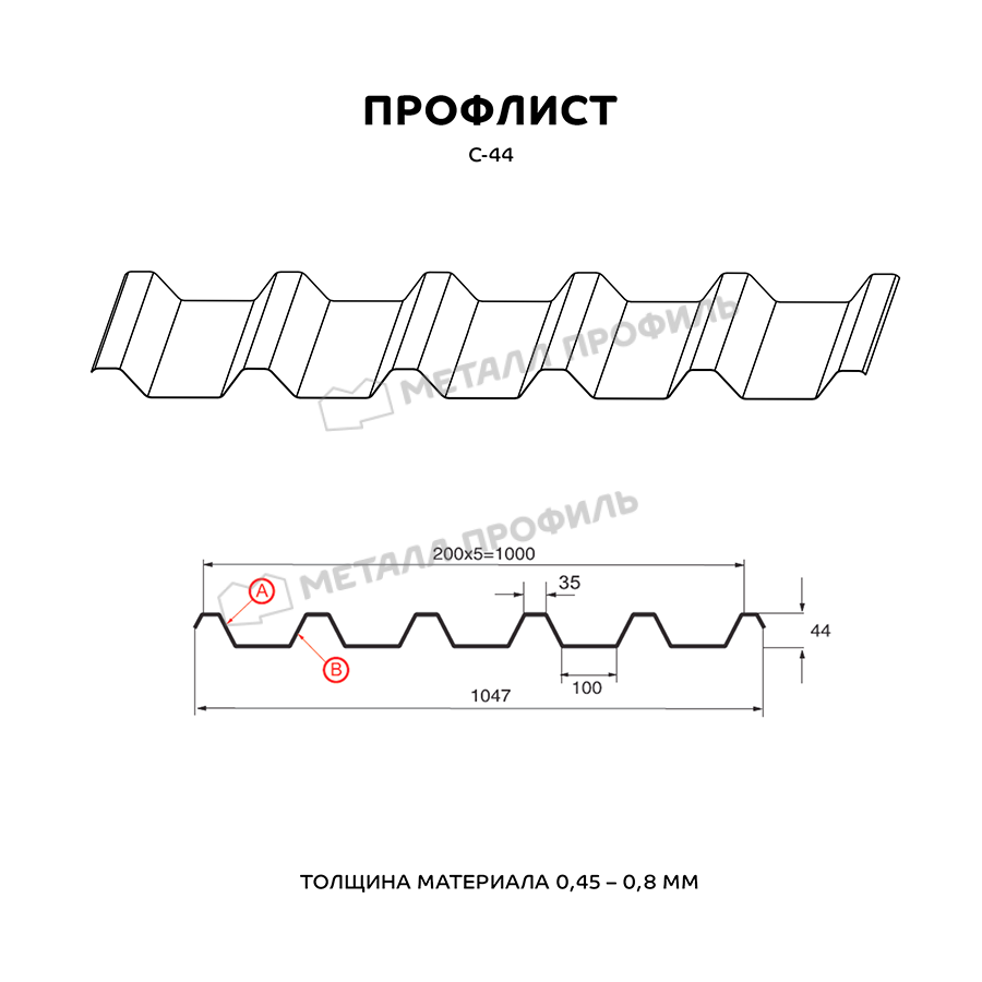 Профиль С-44 имеет трапециевидную форму и толщину 0,5 мм, что обеспечивает прочность и долговечность конструкции.