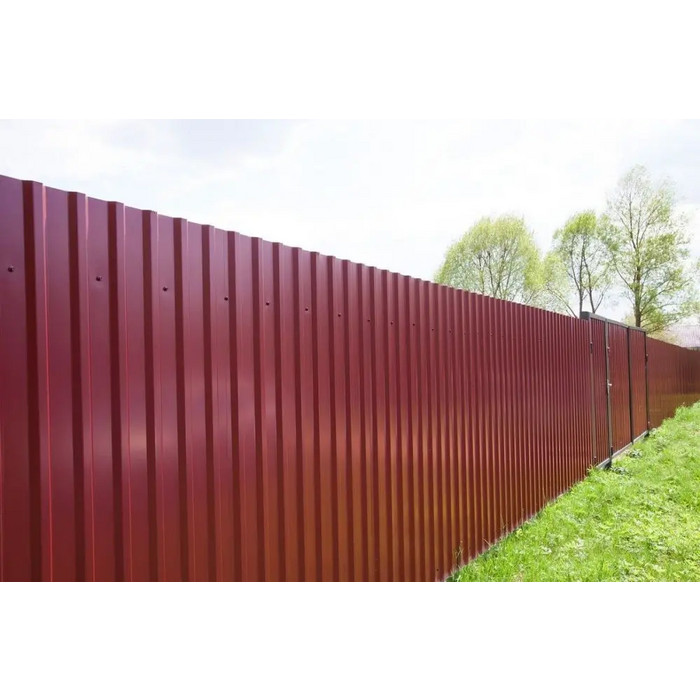Цвет профлиста - RAL 3005 Красное вино, что придает ему элегантный и стильный вид. Благодаря двухстороннему покрытию полиэстером, материал защищен от воздействия влаги, коррозии и ультрафиолетовых лучей, что позволяет использовать его в любых климатических условиях.